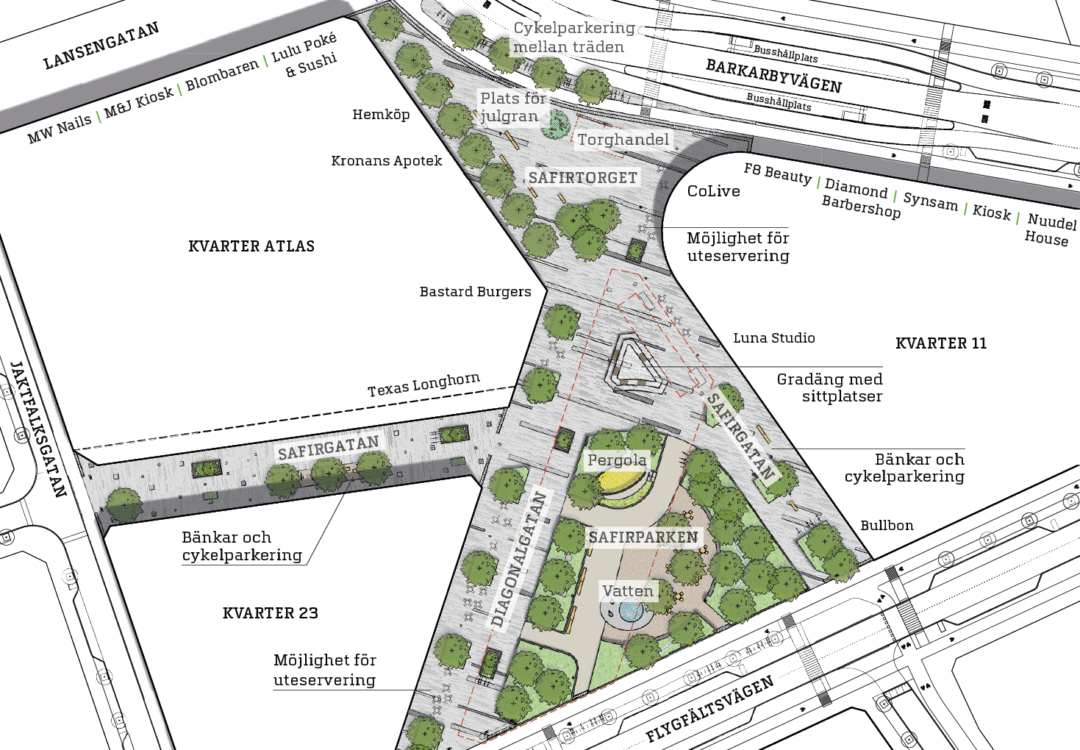 Safirparken ligger granne med Safirtorget, nära Barkarbystadens tunnelbanestation som öppnar i december 2027.