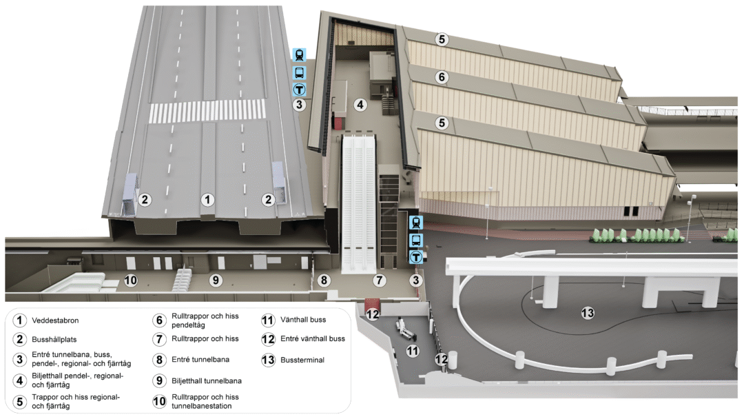 Trafikverket har meddelat att entrén till pendeltåget via stationshuset vid Veddestabron öppnar åtta månader tidigare än planerat – i april 2026 istället för i slutet av 2026. Även om stationshuset börjar se klart ut på utsidan, återstår fortfarande mycket arbete inuti. Just nu arbetar Trafikverket med att färdigställa fasaden på stationshuset med paneler. Nästa steg är att montera hissar och rulltrappor ner till de olika kollektivtrafikslagen. I slutet av 2026 planerar Trafikverket för att öppna entrén från stationshuset till bussterminalen, samtidigt som Region Stockholm öppnar den nya bussterminalen. Trafikstart för tunnelbanan är i december 2027.